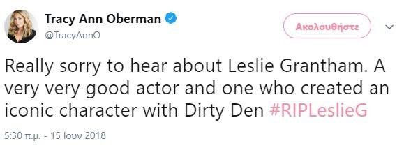 Μεταξύ εκείνων που ενημερώθηκαν για το θάνατό του ήταν και η ηθοποιός Tracey- Ann Oberman που με ανάρτησή της στο twitter εκφράζει τη θλίψη της για έναν πολύ ταλαντούχο ηθοποιό ο οποίος δημιούργησε το χαρακτήρα Dirty Den.