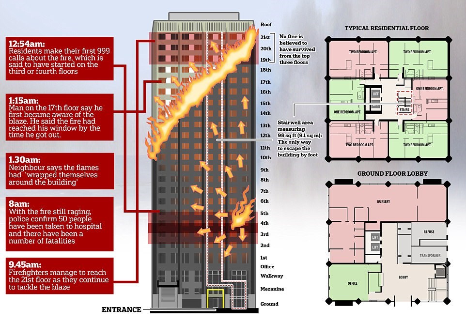 Την ίδια στιγμή αίσθηση προκαλεί η πληροφορία, ότι η φωτιά που ξεκίνησε χθες από τον τρίτο ή τον τέταρτο όροφο του κτιρίου των 24 ορόφων, επεκτάθηκε μέσα σε μόλις 15 λεπτά σε όλους τους ορόφους, προς τα πάνω.