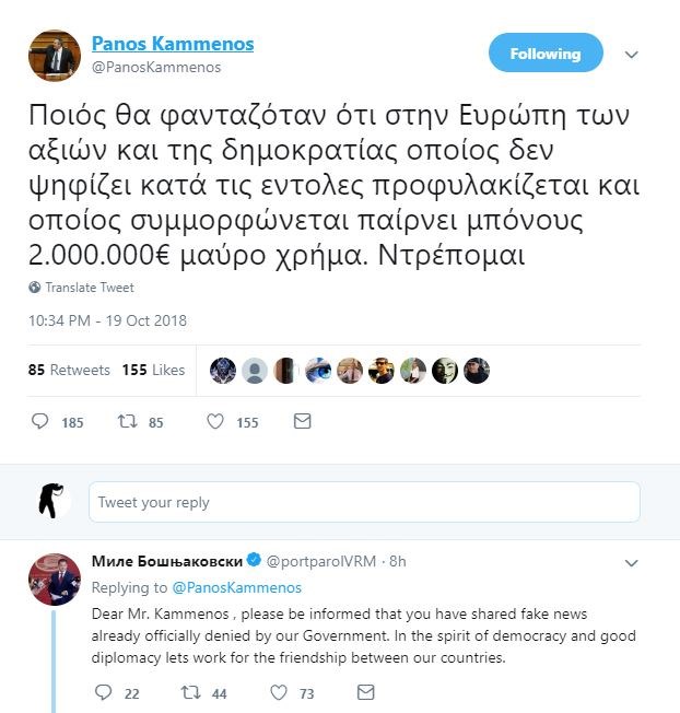 Λίγο αργότερα, ωστόσο, στην ανάρτηση του Πάνου Καμμένου απάντησε σε αυστηρό και έντονο ύφος ο κυβερνητικός εκπρόσωπος των Σκοπίων Μίλε Μποσνιακόφσκι. Στην απάντησή του, επικρίνει τον Έλληνα υπουργό ότι διέδωσε fake news τα οποία είχαν ήδη διαψευσθεί από την κυβέρνηση των Σκοπίων και τον καλούσε για το καλό της δημοκρατίας και της διπλωματίας να εργασθούν για τη φιλία των δύο λαών.