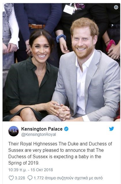 “Ο Δούκας και η Δούκισσα του Sussex είναι πολύ ευτυχείς να ανακοινώσουν ότι η Δούκισσα του Sussex περιμένει μωρό την άνοιξη του 2019”, αναφέρεται χαρακτηριστικά.