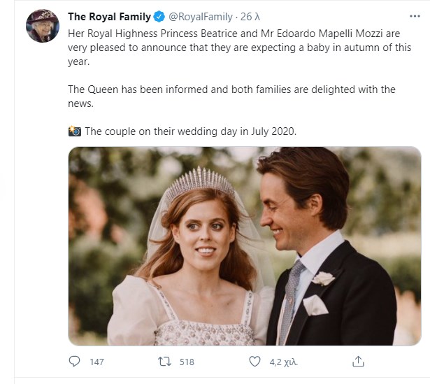 Η πριγκίπισσα Βεατρίκη και ο σύζυγός της Edo Mapelli Mozzi περιμένουν το πρώτο τους παιδί μαζί, σύμφωνα με την ανακοίνωση από το παλάτι του Μπάκιγχαμ. Το ζευγάρι, που παντρεύτηκε τον Σεπτέμβριο του 2020, αναμένεται να υποδεχθεί το μωρό το φθινόπωρο του 2021. Η Βασίλισσα έχει ενημερωθεί και οι δύο οικογένειες είναι ευτυχισμένες με τα νέα της εγκυμοσύνης. Το μωρό θα είναι το δεύτερο εγγόνι για τον πρίγκιπα Άντριου και τη Σάρα Φέργκιουσον.