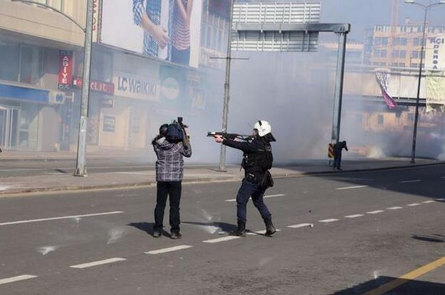 Η φωτογραφία απεικονίζει έναν αστυνομικό, ο οποίος με το όπλο του σημαδεύει έναν εικονολήπτη, ο οποίος βρέθηκε στο σημείο για να καλύψει τα γεγονότα.