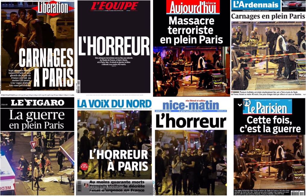 «Τρόμος», «Μακελειό», «Πόλεμος στο Παρίσι», είναι κάποιοι από τους τίτλους των σημερινών πρωτοσέλιδων των μεγαλύτερων εφημερίδων της Γαλλίας.