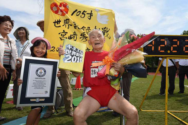 Ο Χιντεκίτσι Μιγιαζάκι, ο αποκαλούμενος και “Χρυσός Μπολτ” -από το όνομα του ταχύτερου ανθρώπου στον πλανήτη- έτρεξε την απόσταση σε 42 δευτερόλεπτα και 22 δέκατα του δευτερολέπτου και έγινε έτσι ο πιο γρήγορος άνδρας άνω των 105 ετών στον κόσμο.