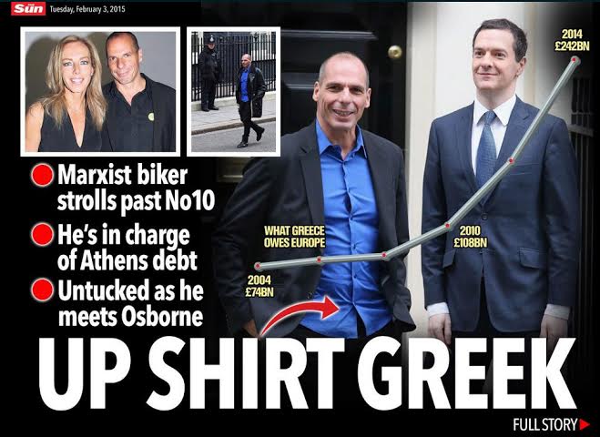 Στο ίδιο ύφος, η Sun, δείχνει με ένα διάγραμμα «τι χρωστάει η Ελλάδα στην Ευρώπη» ενώ φροντίζει να τονίσει με ένα κόκκινο βέλος το πουκάμισο του κ. Βαρουφάκη το οποίο είναι έξω από το παντελόνι του.