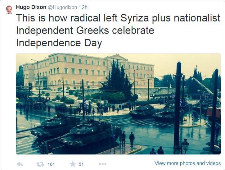 Ο δημοσιογράφος του Reuters, Ούγκο Ντίξον, με ένα tweet στον προσωπικό του λογαριασμό, ειρωνεύτηκε τις εορταστικές εκδηλώσεις με τα άρματα, από μια αριστερή κυβέρνηση του ΣΥΡΙΖΑ.
