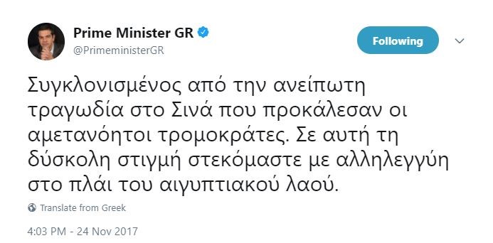 «Συγκλονισμένος από την ανείπωτη τραγωδία στο Σινά που προκάλεσαν οι αμετανόητοι τρομοκράτες. Σε αυτήν τη δύσκολη στιγμή στεκόμαστε με αλληλεγγύη στο πλάι του αιγυπτιακού λαού», αναφέρει ο πρωθυπουργός.