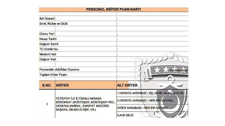 Οι εκκαθαριστικές επιχειρήσεις στις τουρκικές Ένοπλες Δυνάμεις, συνεχίζονται με διώξεις στελεχών που ακόμη και χωρίς στοιχεία θεωρούνται γκιουλενιστές.Στο ναυτικό μάλιστα η ηγεσία έχει αναπτύξει…λογισμικό μέσω του οποίου κάθε στέλεχος κρίνεται για το πόσο γκιουλενιστής είναι! Πρόκειται για το λεγόμενο… FETOμετρο, όπως αναφέρει σε δημοσίευμα της η εφημερίδα, «Milliyet».Όπως αναφέρει ο Αρχηγός του Επιτελείου, έδωσε εντολή για τη δημιουργία του Feto-μετρου. Τα στοιχεία κάθε αξιωματικού μπαίνουν στο πρόγραμμα και αυτό «μετρά» πόσο ύποπτος για σχέσεις με το κίνημα του Φετουλάχ Γκιουλέν είναι ο καθένας.Σύμφωνα πάντα με το ρεπορτάζ 4.500 στελέχη έχουν απομακρυνθεί με βάση τα αποτελέσματα αυτού του προγράμματος.Το πρόγραμμα του ναυτικού τροφοδοτείται με στοιχεία από 16 υπουργεία και 25 δημόσιους οργανισμούςΠηγή ρεπορτάζ: Militaire.grΔείτε τη φωτογραφία: