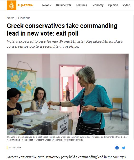 «Οι ψηφοφόροι αναμένεται να δώσουν στο συντηρητικό κόμμα του πρώην πρωθυπουργού, Κυριάκου Μητσοτάκη μία δεύτερη θητεία στην εξουσία», σχολιάζει το δίκτυο Al Jazeera. Ο ανταποκριτής του αραβικού δικτύου στην Αθήνα σχολίασε ότι οι ψηφοφόροι έχουν ως βασικό κριτήριο την οικονομία και δείχνουν εμπιστοσύνη στην Νέα Δημοκρατία γιατί η οικονομία επέστρεψε σε ρυθμούς ανάπτυξης από το 2019.