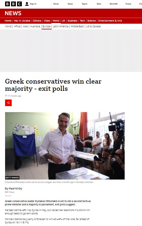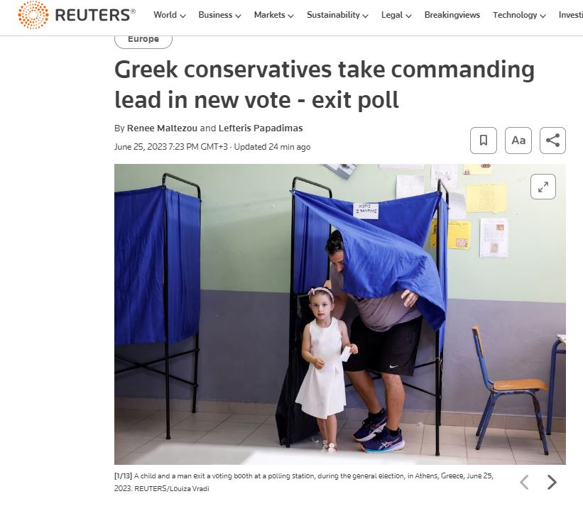 Το πρακτορείο ειδήσεων Reuters γράφει στον τίτλο: «Exit poll: Οι Έλληνες συντηρητικοί λαμβάνουν επιβλητικό προβάδισμα στην νέα ψηφοφορία». Το πρακτορείο μεταδίδει την εκτίμηση του εκλογικού αποτελέσματος και σημειώνει ότι ο Κυριάκος Μητσοτάκης έχει υποσχεθεί να συνεχίσει τις μεταρρυθμίσεις για να χτίσει την εμπιστοσύνη στην ελληνική οικονομία μετά την κρίσης χρέους της τελευταίας δεκαετίας.