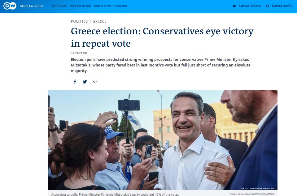 «Ελληνικές εκλογές: Οι Συντηρητικοί βλέπουν νίκη στην επαναληπτική ψηφοφορία». Αυτός είναι ο τίτλος της γερμανικής Deutsche Welle. Το γερμανικό δίκτυο επικαλείται αναλυτές που εξηγούν ότι η νίκη του Κυριάκου Μητσοτάκη οφείλεται στην ανάκαμψη της ελληνικής οικονομίας, την μείωση της ανεργίας και την επιστροφή στην ανάπτυξη υπό την εξουσία της Νέας Δημοκρατίας.