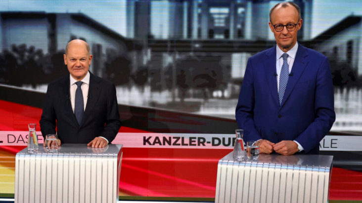Με ζητήματα όπως η μετανάστευση, η οικονομία και οι πιθανές κυβερνητικές συνεργασίες της επόμενης ημέρας κυριάρχησε η τρίτη και τελευταία τηλεμαχία μεταξύ του καγκελάριου Όλαφ Σολτς (SPD) και του υποψηφίου της Χριστιανικής Ένωσης (CDU/CSU), Φρίντριχ Μερτς. Η αναμέτρηση, που μεταδόθηκε από τις Die Welt και Bild, δεν περιλάμβανε ερωτήσεις για την κλιματική αλλαγή, την Ουκρανία ή τις ΗΠΑ, γεγονός που προκάλεσε εντύπωση.