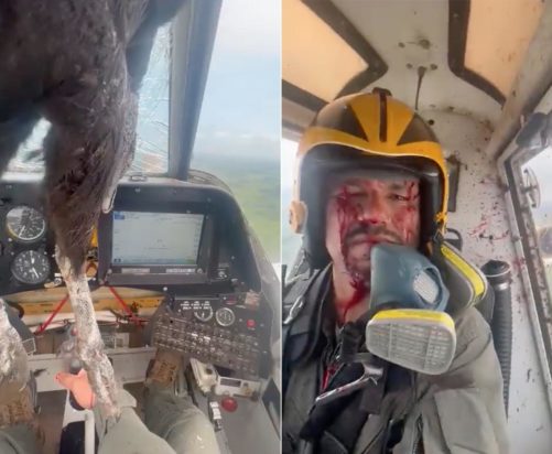 Σε ένα βίντεο που κοινοποίησε ο πιλότος, μπορείτε να δείτε πώς το πουλί βυθίστηκε στην καμπίνα του πιλότου ενώ συνεχίζει να πετάει. Ο καπετάνιος έμεινε με αίματα στο πρόσωπο.