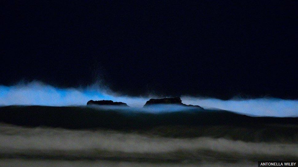Η άνθιση των φυκιών παρατηρήθηκε αυτή την εβδομάδα φωτίζοντας τα κύματα κατά μήκος μιας παράκτιας γραμμής μήκους 15 μιλίων.
