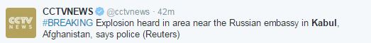 Έκρηξη σημειώθηκε κοντά στην ρωσική πρεσβεία στην Καμπούλ, στο Αφγανιστάν. Όπως μεταδίδουν τα διεθνή μέσα η έκρηξη προκλήθηκε από βόμβα που ήταν τοποθετημένη σε αυτοκίνητο.