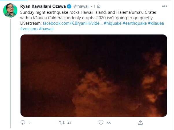Ένα ηφαίστειο στο μεγάλο νησί της Χαβάης εξερράγη, επιβεβαίωσε το U.S. Geological Survey. Η έκρηξη ξεκίνησε αργά την Κυριακή τοπική ώρα εντός του κρατήρα Halema’uma’u, αλλά δεν ήταν αμέσως σαφές πόσο σοβαρό είναι το περιστατικό. Η Εθνική Μετεωρολογική Υπηρεσία στην πρωτεύουσα Χονολουλού προειδοποίησε για πτώση τέφρας από το ηφαίστειο. Είπε ότι η υπερβολική έκθεση στην τέφρα μπορεί να ερεθίσει τα μάτια και το αναπνευστικό σύστημα. Ο χρήστης του Twitter Ryan Kawailani Ozawa είπε: «Ο σεισμός την Κυριακή το βράδυ ταρακούνησε το νησί της Χαβάης και ο κρατήρας Halemaʻuma’u μέσα στην Καλντέρα της Κιλάουέα εξερράγη ξαφνικά. Το 2020 δεν πρόκειται να φύγει ήσυχα”.
