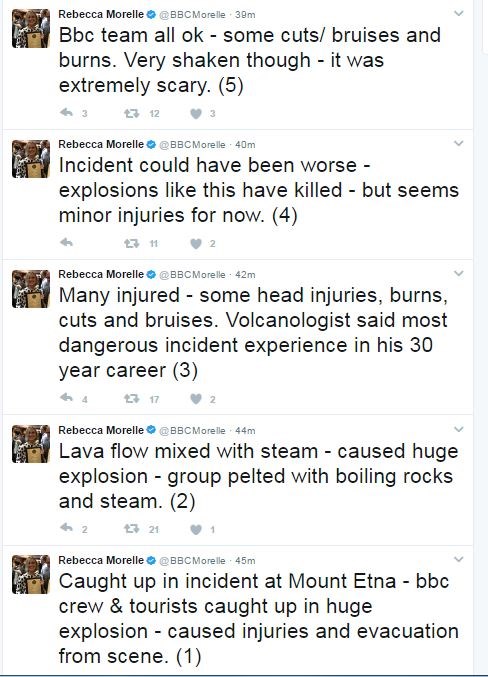 Αρκετοί τουρίστες έχουν υποστεί εγκαύματα και έχουν τραυματιστεί στο κεφάλι, μετά από έκρηξη του ηφαιστείου στο όρος Αίτνα.Η δημοσιογράφος του BBC Rebecca Morelle, ανέφερε μέσα από μια σειρά αναρτήσεων στον προσωπικό της λογαριασμό στο twitter, ότι “πολλοί τουρίστεςτραυματίστηκαν όταν τους χτύπησαν βράχοι”. Στο σημείο έχουν σπεύσει σωστικά συνεργεία, ενώ λέγεται ότι η έκρηξη είναι μία από τις μεγαλύτερες των τελευταίων ετών.Σύμφωνα με πληροφορίες, το συνεργείο του BBC που βρισκόταν στο σημείο, δεν έχει τραυματιστεί σοβαρά.