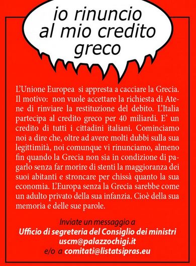 «Η Αθήνα δεν είναι μόνη» τονίζει η ιταλική εφημερίδα Il Manifesto, η οποία ξεκινάει εκστρατεία αλληλεγγύης προς την Ελλάδα ενώ βρίσκονται σε εξέλιξη οι κρίσιμες διαπραγματεύσεις. Η εφημερίδα καλεί τους αναγνώστες της να στείλουν ηλεκτρονικά, επιστολή προς την προεδρία της κυβέρνησης, δηλώνοντας «Παραιτούμαι από το ελληνικό χρέος που μου αναλογεί».