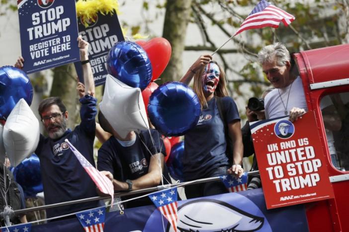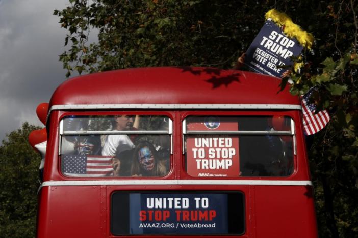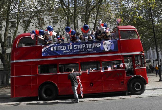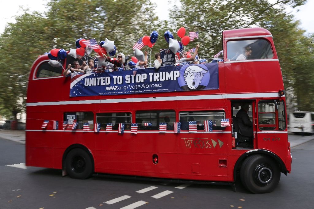 Αμερικανοί υπήκοοι που διαμένουν στη Βρετανία γύρισαν τους δρόμους του Λονδίνου με ένα κόκκινο λεωφορείο και στόχο να πείσουν τους συμπατριώτες τους να αναχαιτίσουν με την ψήφο τους την πορεία του υποψηφίου του Ρεπουμπλικανικού Κόμματος Ντόναλντ Τραμπ προς τον προεδρικό θώκο στις εκλογές του Νοεμβρίου.