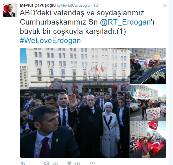 «Ο πρόεδρός μας κ. Ερντογάν έγινε δεκτός με μεγάλο ενθουσιασμό από αμερικανούς πολίτες και από τους συμπατριώτες μας», έγραψε ο υπουργός Εξωτερικών Μεβλούτ Τσαβούσογλου, ο οποίος συνοδεύει τον Πρόεδρο στην Ουάσινγκτον.