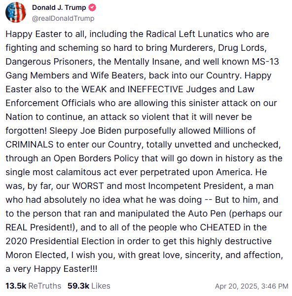 Ο Ρεπουμπλικάνος αρχηγός του κράτους επέκρινε τους «μουρλούς της ριζοσπαστικής αριστεράς», Δημοκρατικούς που αγωνίζονται κατ’ αυτόν για να «ξαναφέρουν στη χώρα μας δολοφόνους, βαρόνους των ναρκωτικών, επικίνδυνους κρατούμενους, ψυχικά ανισόρροπους, τύπους που δέρνουν τις γυναίκες τους και γνωστά μέλη της συμμορίας MS-13», σε «ευχετήριο» μήνυμά του για το Πάσχα μέσω Truth Social.