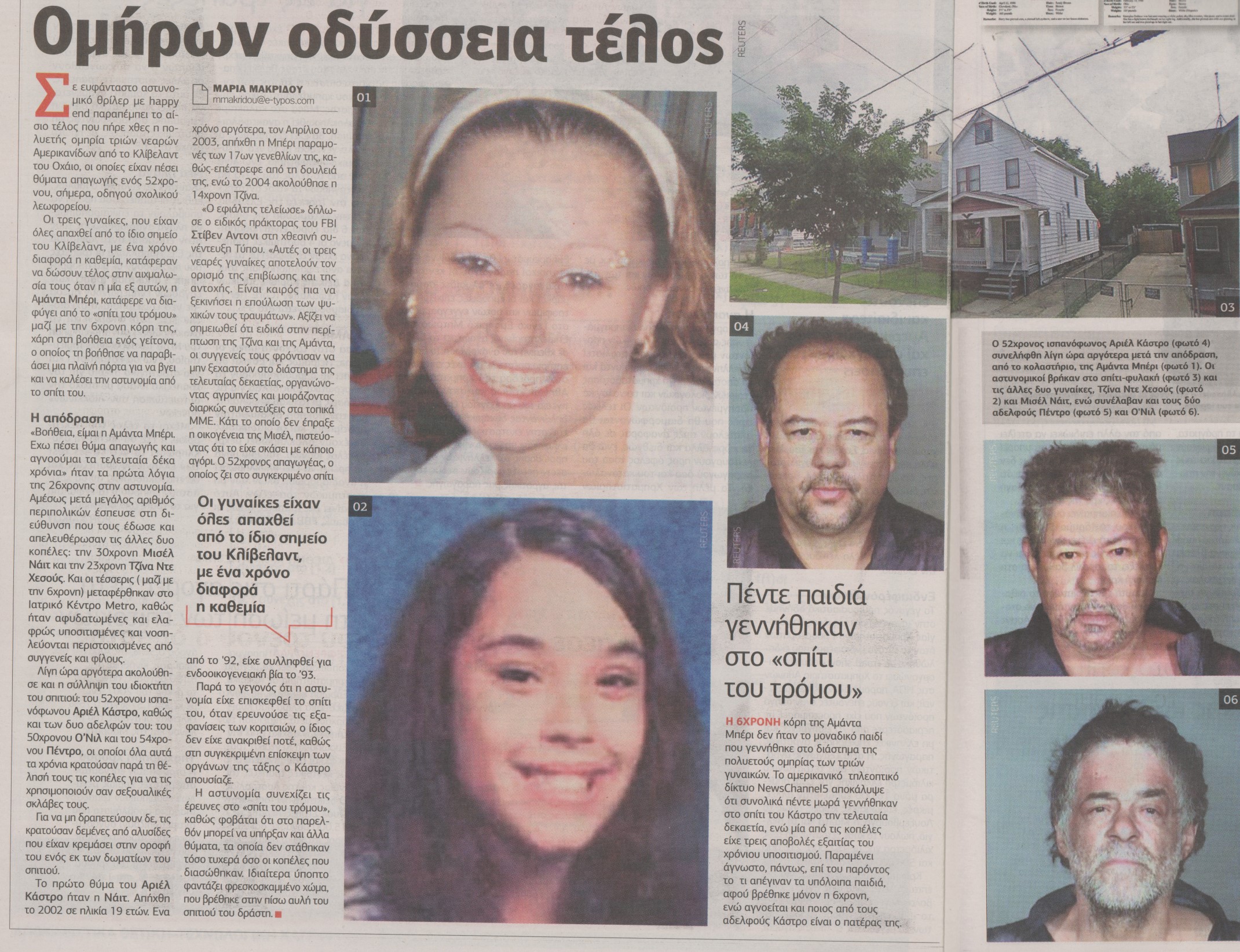 Σ΄ ένα ευφάνταστο αστυνομικό θρίλερ με happy end παραπέμπει το αίσιο τέλος που πήρε χθες η πολυετής ομηρία τριών νεαρών Αμερικανίδων από το Κλίβελαντ του Οχάιο, οι οποίες είχαν πέσει θύματα απαγωγής ενός 52χρονου οδηγού σχολικού λεωφορείου.