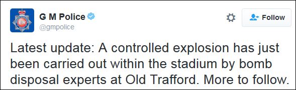 Ελεγχόμενη έκρηξη στο ύποπτο δέμα που εντοπίστηκε στο Ολντ Τράφορντ πραγματοποίησαν πριν από λίγο οι πυροτεχνουργοί της βρετανικής αστυνομίας. Σύμφωνα με πληροφορίες σε λίγα λεπτά θα γίνει γνωστό το τι περιείχε το ύποπτο πακέτο, το οποίο οδήγησε στην αναβολή του αγώνα της Μάντσεστερ Γιουνάιτεντ με την Μπόρνμουθ.