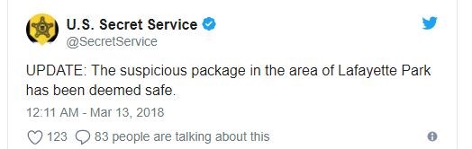 Σε tweet οι αμερικανικές μυστικές υπηρεσίες ανέφεραν ότι έπειτα από έρευνα των Αρχών το ύποπτο πακέτο έχει «θεωρηθεί ασφαλές». Δείτε το tweet των αμερικανικών μυστικών υπηρεσιών: