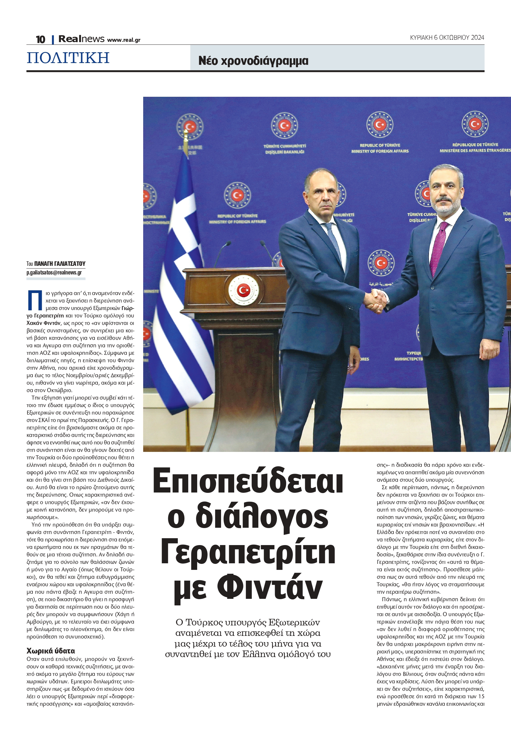 Πιο γρήγορα απ’ ό,τι αναμενόταν ενδέχεται να ξεκινήσει η διερεύνηση ανάμεσα στον υπουργό Εξωτερικών Γιώργο Γεραπετρίτη και τον Τούρκο ομόλογό του Χακάν Φιντάν, ως προς το «αν υφίστανται οι βασικές συνισταμένες, αν συντρέχει μια κοινή βάση κατανόησης για να εισέλθουν Αθήνα και Αγκυρα στη συζήτηση για την οριοθέτηση ΑΟΖ και υφαλοκρηπίδας». Σύμφωνα με διπλωματικές πηγές, η επίσκεψη του Φιντάν στην Αθήνα, που αρχικά είχε χρονοδιάγραμμα έως το τέλος Νοεμβρίου/αρχές Δεκεμβρίου, πιθανόν να γίνει νωρίτερα, ακόμα και μέσα στον Οκτώβριο.