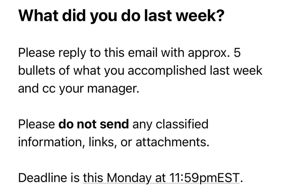 Σε αυτό το μήνυμα ηλεκτρονικού ταχυδρομείου προς τους ομοσπονδιακούς υπαλλήλους, η OPM τους ζητούσε να απαντήσουν ως τη Δευτέρα το βράδυ και να περιγράψουν πέντε εργασίες που ολοκλήρωσαν στη διάρκεια της προηγούμενης εβδομάδας. Ωστόσο στο email η υπηρεσία τόνιζε ότι οι υπάλληλοι δεν θα πρέπει να αποκαλύψουν απόρρητες πληροφορίες.