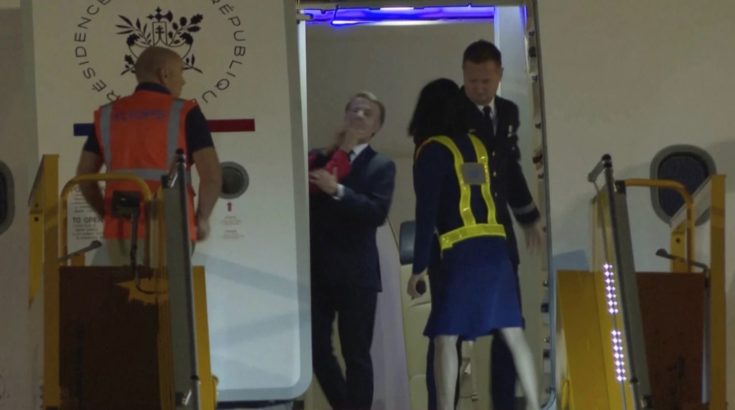 Στο βίντεο, η Μπριζίτ Μακρόν σπρώχνει απότομα το πρόσωπο του Γάλλου Προέδρου, τη στιγμή που εκείνος γυρίζει προς το μέρος της στην πόρτα του αεροσκάφους. Ο Μακρόν φαίνεται να χάνει στιγμιαία την ισορροπία του, στη συνέχεια σηκώνει αμήχανα το χέρι του και χαιρετά.