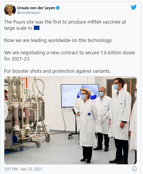 Σημειώνεται πως νωρίτερα, Ευρωπαίος αξιωματούχος είχε δηλώσει στο Reuters ότι η Ένωση έκλεισε με τις Pfizer-BioNTech συμφωνία για την προμήθεια 1,8 δισ. δόσεων, που αποτελεί το μεγαλύτερο τέτοιο συμβόλαιο παγκοσμίως. Η συγκεκριμένη συμφωνία επαρκεί για την κάλυψη του πληθυσμού των 450 εκατ. κατοίκων της Ευρωπαϊκής Ένωσης για τα επόμενα δύο χρόνια. Είναι το τρίτο συμβόλαιο που συμφωνείται ανάμεσα στην Ένωση και τις δύο εταιρείες, οι οποίες έχουν ήδη συμφωνήσει για την προμήθεια 600 εκατομμυρίων δόσεων αυτόν τον χρόνο βάσει των δύο προηγούμενων συμβολαίων.