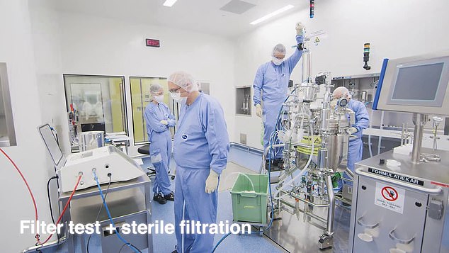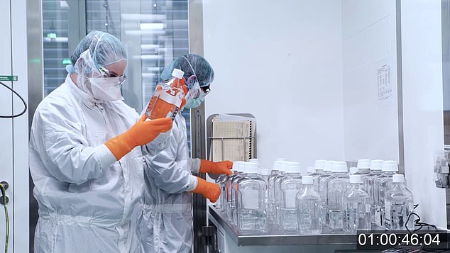 2 Γραμμή παραγωγής: Τεχνικοί εργαστηρίου συλλέγουν το εμβόλιο σε ειδικές φιάλες υπό ειδικά αποστειρωμένο περιβάλλον.