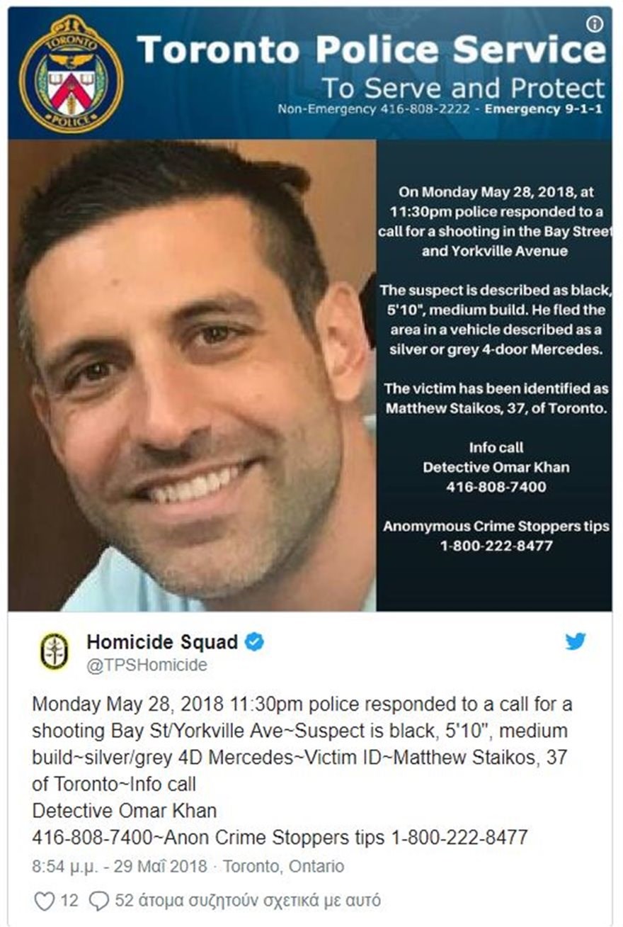Ο Μάθιου Στάικος, διευθύνων σύμβουλος μίας εταιρείας τεχνολογίας, πυροβολήθηκε εξ’ επαφής στην περιοχή Γιόρκβιλ του Τορόντο. Ο 37χρονος Έλληνας επιχειρηματίας βρέθηκε θανάσιμα τραυματισμένος έπειτα από τις αναφορές για τουλάχιστον τρεις πυροβολισμούς περίπου στις 11.30 το βράδυ της Δευτέρας.