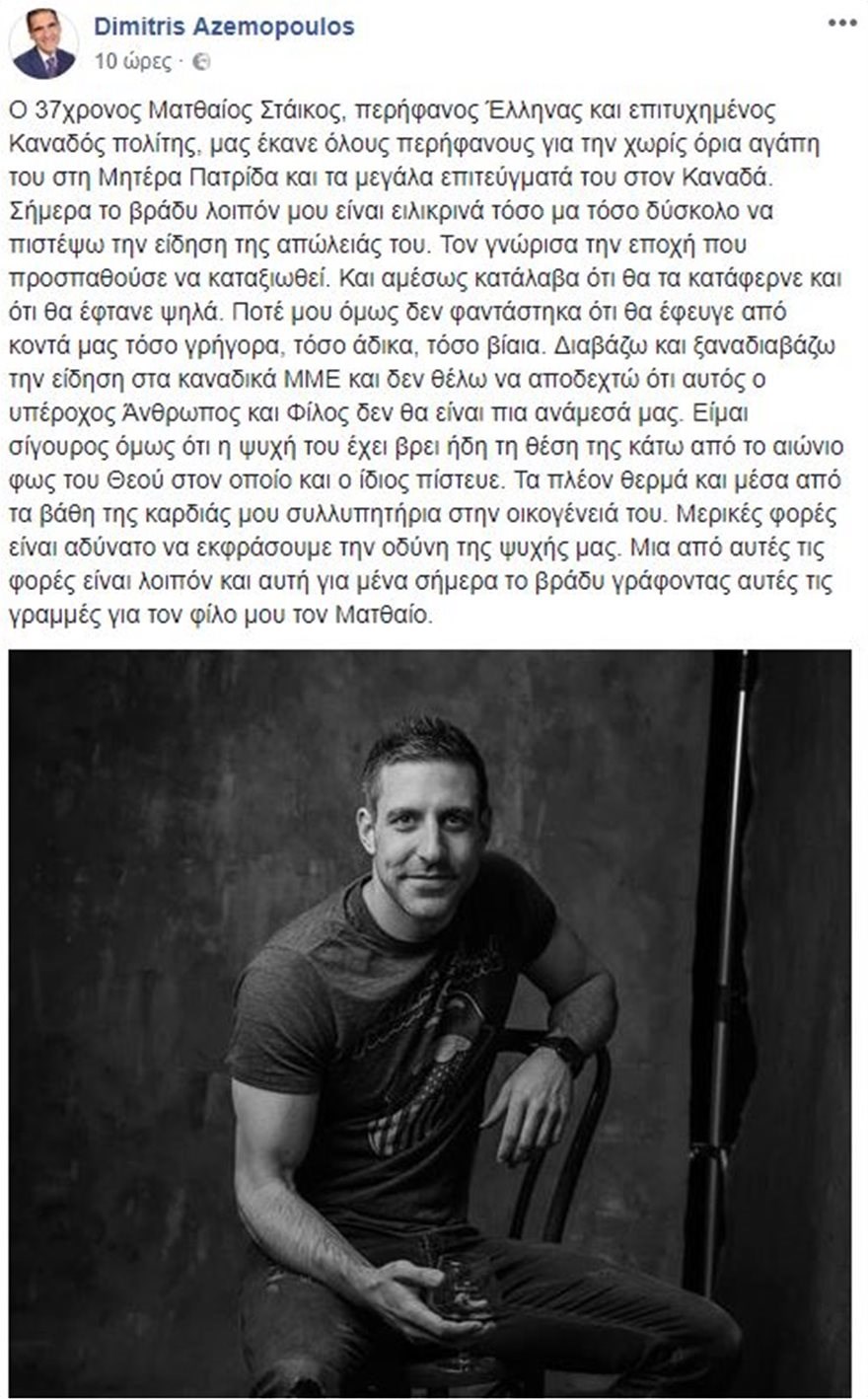 Συγκλονιστικό πάντως, είναι και το μήνυμα του Έλληνα πρέσβη στον Καναδά, Δημήτρη Αζεμόπουλου ο οποίος γνώριζε τον 37χρονο που έφυγε τόσο βίαια από τη ζωή.