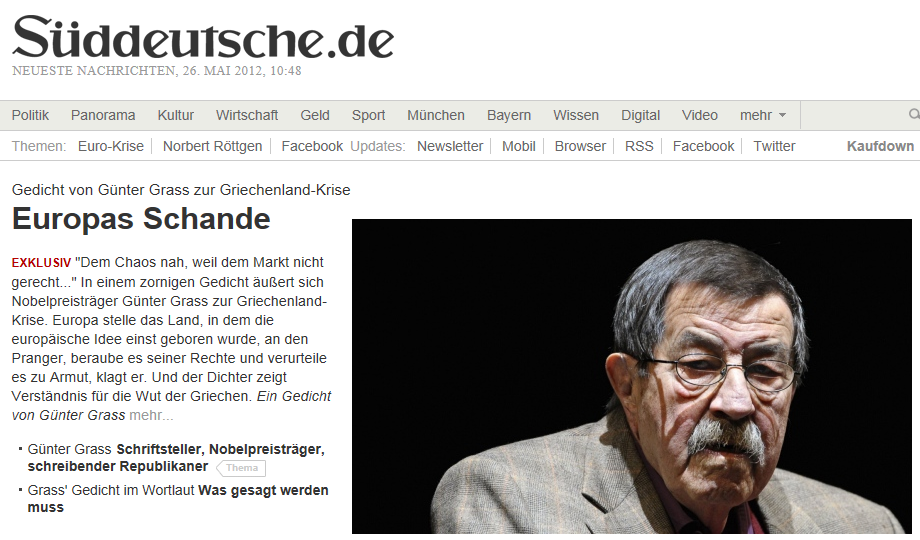 Το ποίημα δημοσιεύει σήμερα η γερμανική εφημερίδα Sueddeutsche Zeitung και μεταξύ άλλων αναφέρει: