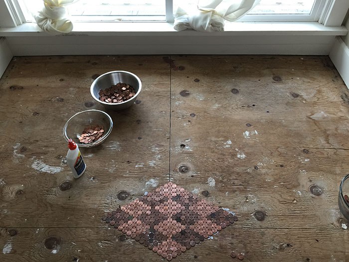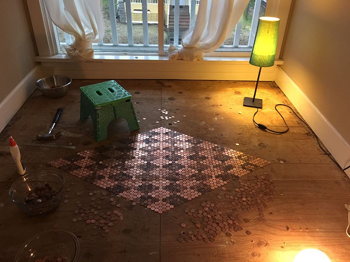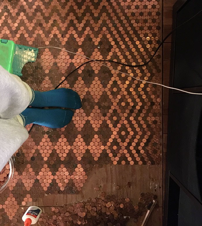 Βλέποντας το συγκεκριμένο πάτωμα, είναι σίγουρο πως δεν θα καταλαβαίνατε από τι είναι φτιαγμένο. Η Αμερικανίδα Tonya Tooners, είχε μια πρωτότυπη ιδέα να χρησιμοποιήσει κέρματα για να φτιάξει αυτό το πρωτότυπο πάτωμα στο σπίτι της.Το υπέροχο μωσαϊκό αποτελείται από 13,000 κέρματα, και όπως βλέπετε στις φωτογραφίες, το αποτέλεσμα «αξίζει κάθε δεκάρα». Η Τόνια Τούνερς, που κατάγεται από το Πόρτλαντ του Όρεγκον, χρησιμοποίησε τρεις σακούλες με κέρματα από τράπεζα, δέκα μπουκάλια κόλλα, στόκο, σοβά και ακριβή εποξεική ρητίνη. Της πήρε λίγους μήνες για να ολοκληρώσει το έργο της, ενώ συχνά διακοπτόταν από τον σκύλο της, που… έκανε την ανάγκη του πάνω στα κέρματα.Η ίδια είπε πως δεν είχε κάποιο συγκεκριμένο σχέδιο στο μυαλό της και ότι απλά «ξεκίνησε κάνοντας ρόμβους, της άρεσε πώς φαίνονταν και έτσι συνέχισε». Δείτε το εντυπωσιακό πάτωμα: