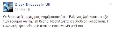 “Οι Βρετανικές αρχές μας ενημέρωσαν ότι ένας Έλληνας βρίσκεται μεταξύ των τραυματιών της επίθεσης. Νοσηλεύεται σε σταθερή κατάσταση. Η Ελληνική Πρεσβεία βρίσκεται σε επικοινωνία μαζί του” αναφέρεται στην ανάρτηση.