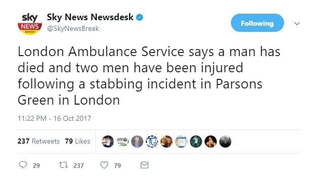 Σύμφωνα με πληροφορίες του Skynews, το βρετανικό ΕΚΑΒ επιβεβαίωσε πως ένας εκ των τριών τραυματιών που μεταφέρθηκαν στο νοσοκομείο, έχασε τη ζωή του.