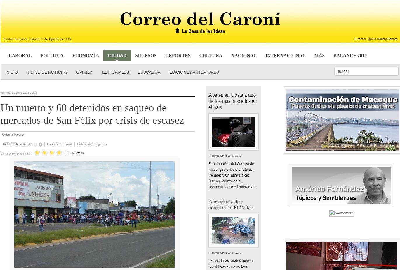 Καταναλωτές που έψαχναν βασικά διατροφικά είδη, όπως γάλα, ρύζι και αλεύρι μπήκαν διά της βίας στην αποθήκη ενός σούπερ μάρκετ χθες το πρωί, με αποτέλεσμα πολλοί επιχειρηματίες στην περιοχή να κλειδώσουν τα καταστήματά τους, ανέφερε η εφημερίδα Correo del Caroni.