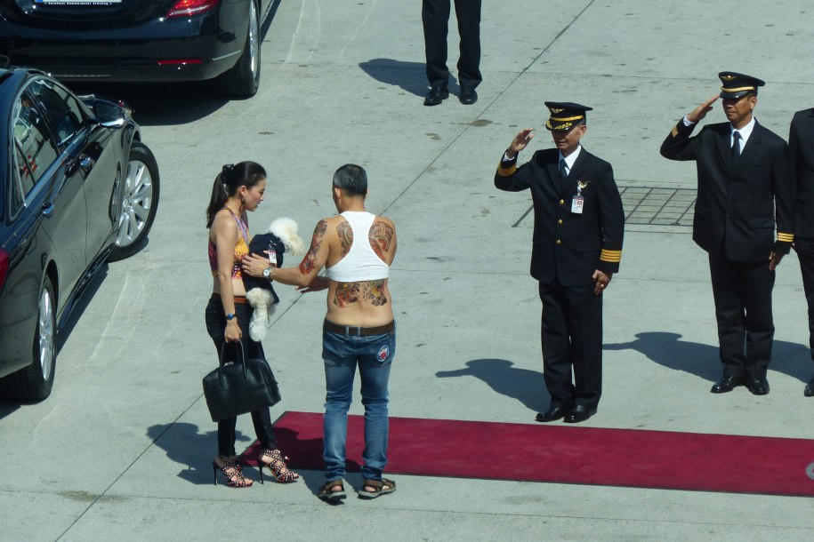 Οι φωτογραφίες που τραβήχτηκαν πρόσφατα στο αεροδρόμιο του Μονάχου και ήρθαν στη δημοσιότητα τις τελευταίες ώρες, δείχνουν τον Βατζιραλονγκόρν να φοράει ένα τζιν παντελόνι, ένα κοντό άσπρο φανελάκι και να έχει στην πλάτη του τατουάζ.