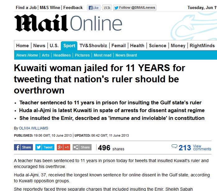 Μία δασκάλα 37 χρονών από το Κουβέιτ καταδικάστηκε σε ενδεκαετή κάθειρξη επειδή προσέλαβε τον εμίρη του Κατάρ μέσω twitter καθώς τον χαρακτήρισε ως “άνοσο και απρόσβλητο”.