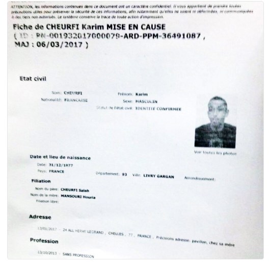 Πρόκειται για τον 39χρονο Καρίμ Σερφί, που ζούσε σε προάστιο του Παρισιού και ήταν καταχωρημένος στη λίστα «S» της αντιτρομοκρατικής υπηρεσίας. Την ίδια ώρα, οι γαλλικές Αρχές έχουν ειδοποιηθεί ότι ένας Βέλγος που έχει ορκιστεί πίστη στο Ισλαμικό κράτος, ο Γιουσούφ Ελ Οσρί αναχώρησε χθες στις 6 το πρωί για το Παρίσι. Η φωτογραφία ανήκει στον μαχητή «Αμπου Γιουσέφ ο Βέλγος»