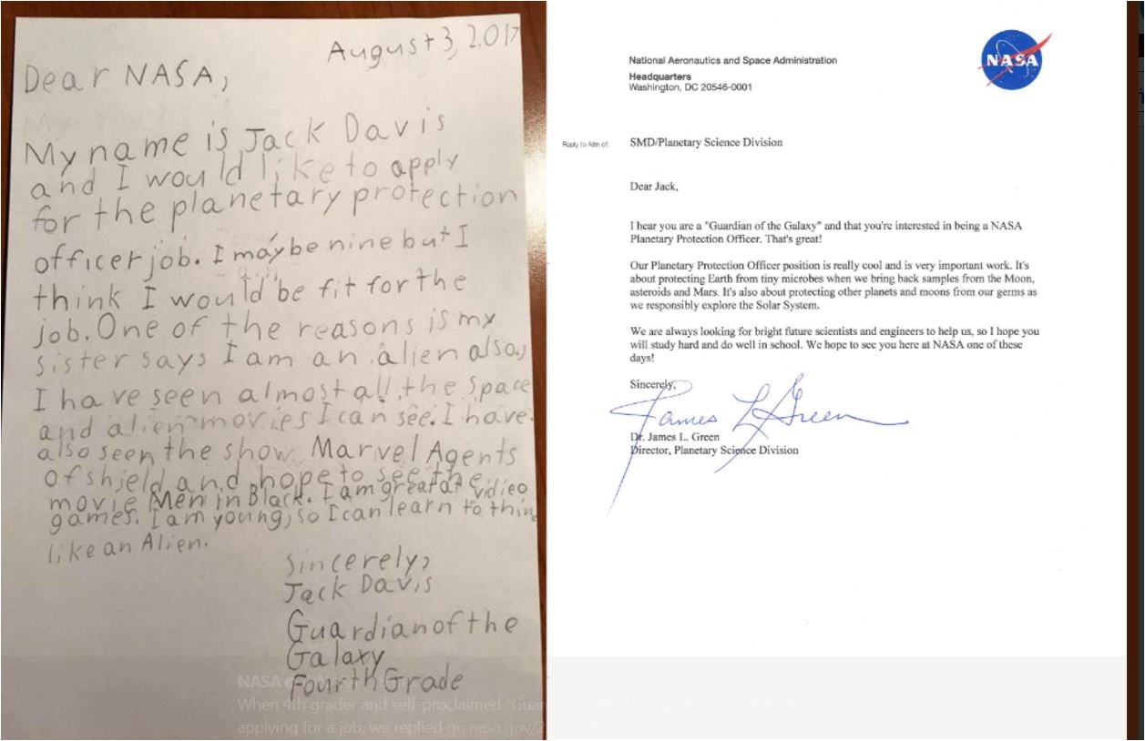 Το ενδιαφέρον ενός εννιάχρονου αγοριού από τις ΗΠΑ, κίνησε η ανακοίνωση της NASA, για τη θέση του «υπεύθυνου πλανητικής προστασίας».Το αγόρι από το Νιου Τζέρσεϊ απέστειλε χειρόγραφη επιστολή στην αμερικανική διαστημική υπηρεσία, υποστηρίζοντας πως είναι ο καταλληλότερος για τη συγκεκριμένη θέση.«Ένας από τους λόγους είναι ότι η αδελφή μου λέει πως είμαι εξωγήινος και επίσης έχω δει όλες τις διαστημικές ταινίες που μπορώ», έγραφε μεταξύ άλλων, στην επιστολή του.Μάλιστα, έλαβε άμεσα απάντηση από τη NASA, η οποία τον συνεχάρη για το ενδιαφέρον του και του εξήγησε πόσο σπουδαία είναι η θέση του υπευθύνου πολιτικής προστασίας.Το εννιάχρονο αγόρι, έκπληκτο, δέχθηκε και τηλεφώνημα από τον διευθυντή του τμήματος πλανητικής έρευνας της NASA, ο οποίος επίσης τον συνεχάρη για το ενδιαφέρον του.