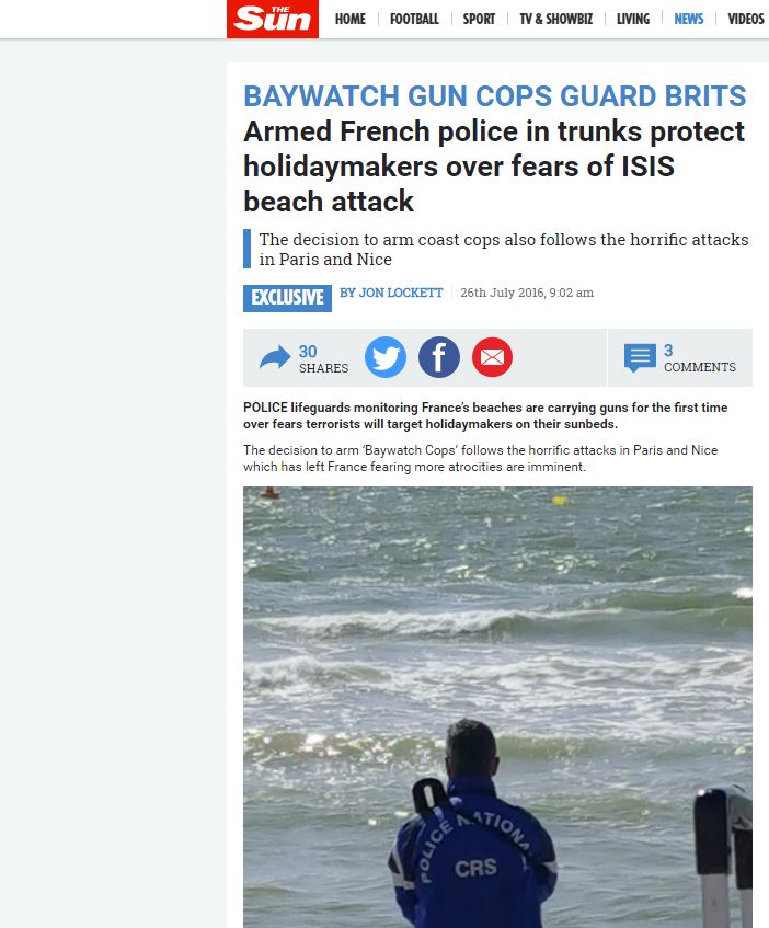 Όπως αναφέρει σε δημοσίευμά της η βρετανική “The Sun”, η Γαλλία έφτιαξε το “Baywatch Cops” δηλαδή κάτι σαν… ναυαγοσώστες αστυνομικούς με όπλα, υπό το φόβο ότι τρομοκράτες θα ανοίξουν πυρ κατά τουριστών που απολαμβάνουν το μπάνιο τους.