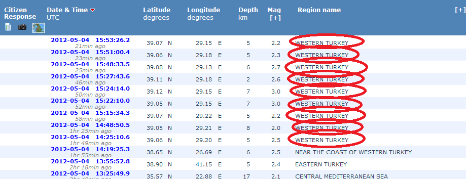 Έντονη σεισμική δραστηριότητα παρατηρείται σήμερα στην Δυτική Τουρκία. Είναι χαρακτηριστικό ότι μέσα στις τελευταίες 2 ώρες , έχουν σημειωθεί 9 σεισμικές δονήσεις.Δείτε την δραστηριότητα όπως καταγράφεται από το Ευρωμεσογειακό Σεισμολογικό Κέντρο: