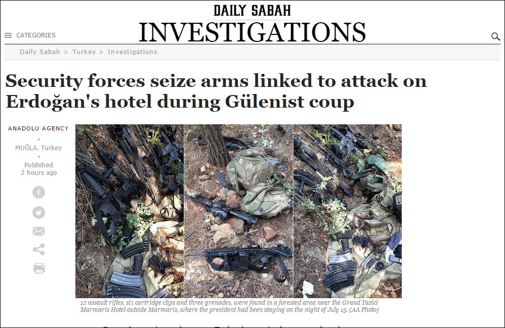 Οι τουρκικές Αρχές εντόπισαν και κατέσχεσαν βαρύ οπλισμό που φέρεται να χρησιμοποιήθηκε στην επίθεση κατά του ξενοδοχείου όπου βρισκόταν ο Πρόεδρος Ρετζέπ Ταγίπ Ερντογάν κατά τη διάρκεια της εκδήλωσης της απόπειρας πραξικοπήματος, σύμφωνα με την Daily Sabah.