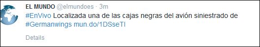 Το ένα από τα δύο μαύρα κουτιά του Airbus Α320 της γερμανικής εταιρείας χαμηλού κόστους Germanwings που συνετρίβη στις Γαλλικές Άλπεις, εντοπίστηκε πριν από λίγο, σύμφωνα με την εφημερίδα El Mundo.