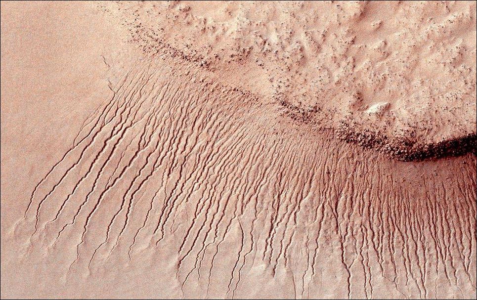 Τα μικρά ρυάκια αφήνουν σκούρα σημάδια στο έδαφος του Άρη, προτού ξεραθούν το φθινόπωρο, καθώς η θερμοκρασία πέφτει.