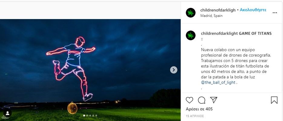Μία εντυπωσιακή ζωγραφιά φωτός με πέντε drones δημιούργησε στον ουρανό ο Ισπανός καλλιτέχνης, Φρόντο Αλβάρες που είναι γνωστός στο ευρύ κοινό ως «Children of Light». Από το 2009, ο Αλβάρες ζωγραφίζει με φως και από το 2015 ασκεί επαγγελματικά αυτή την τέχνη. Για το συγκεκριμένο πρότζεκτ, το στούντιο Creartys Production πλησίασε τον Ισπανό καλλιτέχνη, ο οποίος συνεργάστηκε με την ομάδα drones του UMILES Drone Light Show για να σχεδιάσει και να ζωγραφίσει τον ύψους 40 μέτρων ποδοσφαιριστή που είναι έτοιμος να σουτάρει την μπάλα στον ουρανό.
